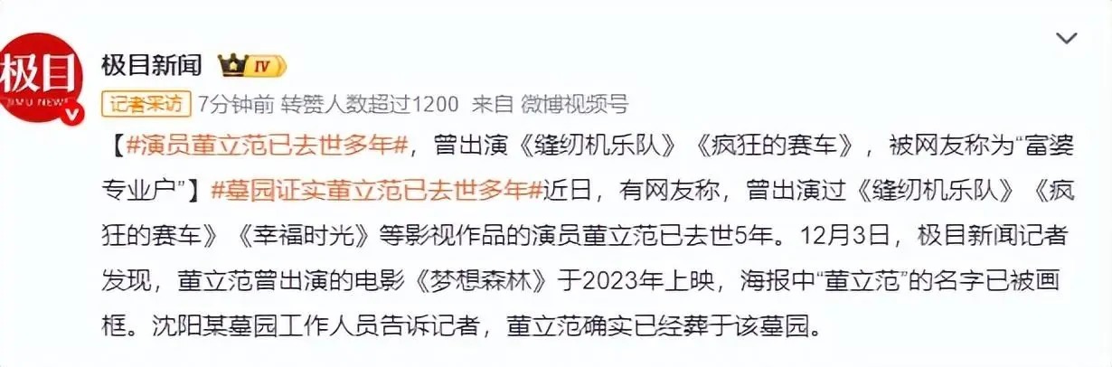 据了解,12日的时候,有网友在翻看大鹏成名作的留言时,得知董立范已号去世了。